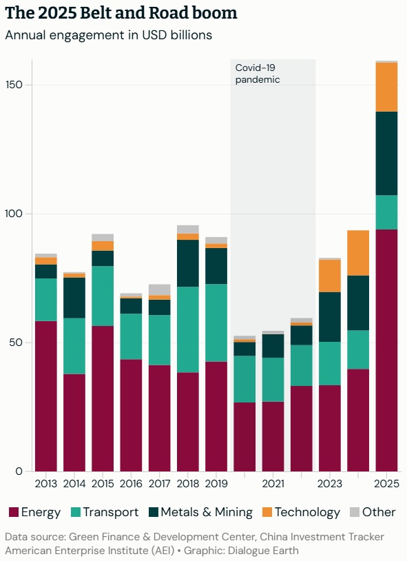 Last year, Chinese companies’ “engagement” in 150 countries involved in the Belt and Road Initiative (BRI) reached its highest level since the BRI was launched 12 years ago. The value of construction deals involving Chinese companies reached USD 128 billion, up 81% on 2024. While investments totalled USD 85 billion, up 62%. The unprecedented boom has been revealed by annual data from the Griffith Asia Institute, an Australian think-tank, and the Green Finance and Development Center, a think-tank hosted in Fudan University, Shanghai. “I did not foresee last year that 2025 would be such a strong year [for BRI engagement],” said report author Christoph Nedopil Wang during an online launch. “Engagement” refers to both investments by Chinese companies, implying an ownership stake in a project, and the value of construction contracts awarded to them for engineering services. The striking upsurge comes after years of government-directed messaging, and analyst predictions, that the initiative would focus more on “small and beautiful” projects, rather than the mega projects pursued in its early years. “Small yet beautiful should be seen as a bygone,” Nedopil Wang said, noting both the total value of construction and investment deals, and the growth in average project value. Last year also saw notable shifts in the targets for Chinese companies’ activities around the world. Their engagement in renewable-energy projects grew in 2025 but not as rapidly as in oil and gas projects, which will concern many. Rapid growth in engagement in mining, and in the technology and manufacturing sector, demonstrates the evolution of the BRI since it began in 2013. Finally, Africa became the top destination for Chinese companies’ overseas engagement.