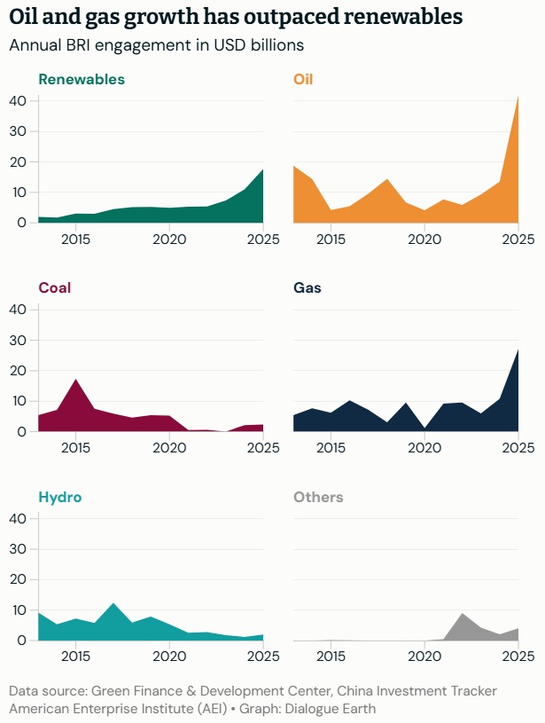 Energy was once again the top sector for engagement in Belt and Road countries, accounting for about 43% of the total. Total engagement in energy sectors reached USD 93.9 billion, the highest ever recorded. However, while just a few years ago renewable-energy projects accounted for nearly half of total energy projects overseas, in 2025 renewables made up just 21%, while fossil fuels accounted for over 75%.