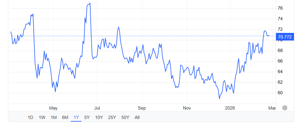 On the other hand, Brent crude oil futures rebounded 2% to above $70 per barrel on February 25, 2026, reversing earlier losses.