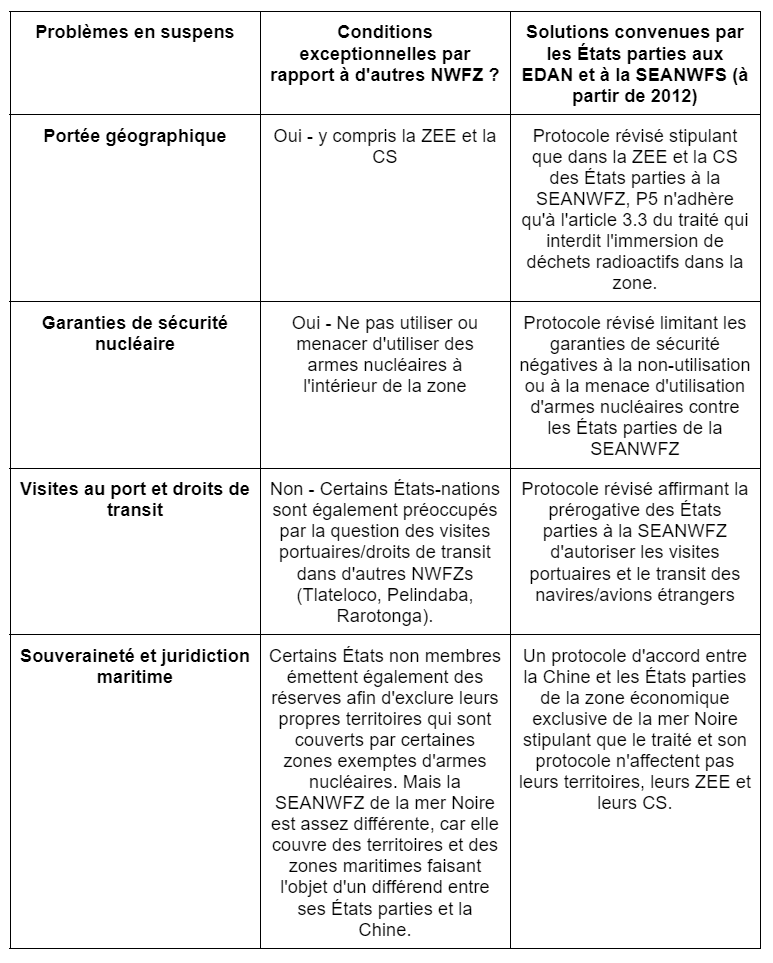 Les États membres du SEANWFZ, qui sont également les dix États membres de l'ASANE, ont entrepris de nombreuses consultations avec les États détenteurs d'armes nucléaires (NWS) dans le but de les persuader d'adhérer au Protocole. Les P5 soulèvent des objections et des préoccupations concernant certaines dispositions substantielles du Traité et de son Protocole (voir Tableau 1).