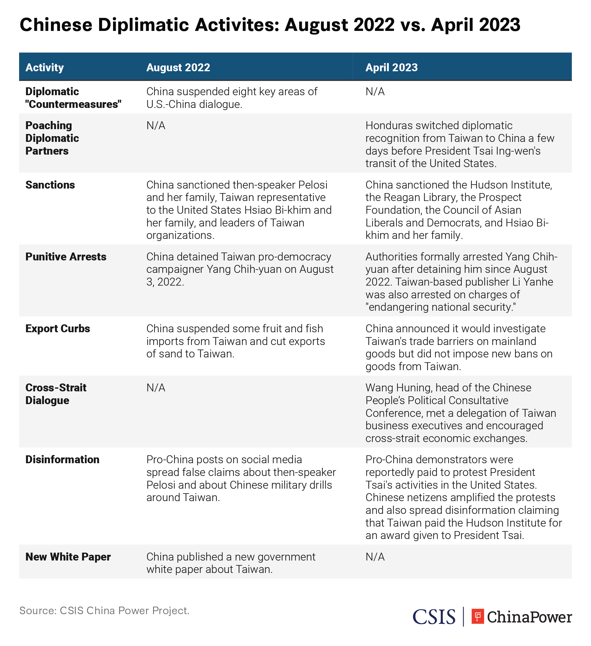 Повторяя свои действия в августе, в апреле этого года Пекин также наказал несколько американских и тайваньских организаций и отдельных лиц. Оба учреждения США, в которых размещалась Цай, — Институт Гудзона и Президентская библиотека Рональда Рейгана — попали под санкции. Во второй раз Китай также ввел санкции против представителя Тайваня в США Сьяу Бикхим, а также ее семьи и связанных с ней инвесторов и фирм. После завершения транзита Цай председатель комитета по иностранным делам Палаты представителей США Майкл Маккол встретился с Цай на Тайване, и вскоре после этого Китай также объявил о санкциях в отношении Маккола. Пекин использовал эти санкции для целенаправленного принуждения. Они позволяют Пекину показать отечественной и зарубежной аудитории, что он применяет наказания, но практически не оказывают ощутимого воздействия на широкую общественность Тайваня или США.