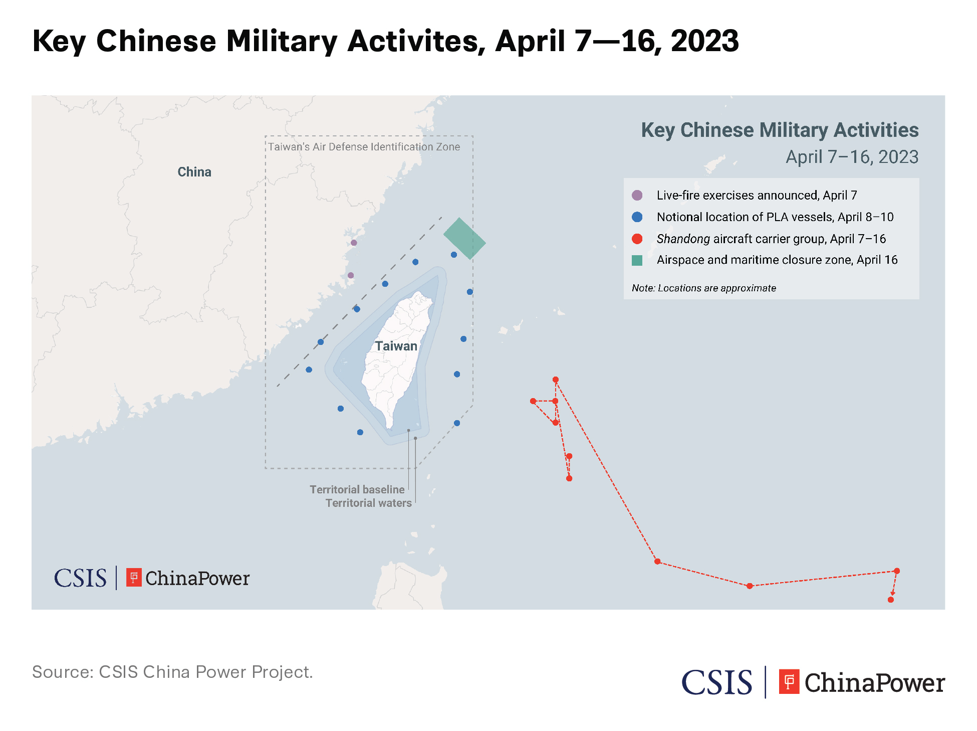 После этих первоначальных действий командование Восточного театра военных действий НОАК объявило, что с 8 по 10 апреля оно «организует патрулирование боевой готовности вокруг острова Тайвань и проведет учения “Совместный меч” в Тайваньском проливе, вокруг северной и южной частей острова Тайвань, а также в море и воздушном пространстве к востоку от острова Тайвань». Эти учения были центральным элементом военных действий Китая в апреле 2023 года и напоминали крупномасштабные учения августа 2022 года.