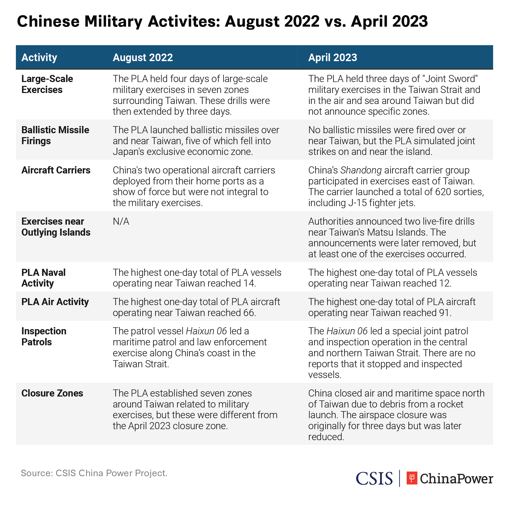 À première vue, certains aspects de ces exercices suggèrent une démonstration de force militaire globalement réduite par rapport au mois d'août. Les exercices Joint Sword d'avril ont duré trois jours, tandis que les exercices d'août étaient initialement prévus pour quatre jours et ont ensuite été étendus à sept jours. Plus important encore, les exercices d'avril n'ont pas inclus de tirs réels de missiles balistiques hautement provocateurs, comme cela avait été le cas en août. Le 4 août 2022, la force de fusée de l'APL avait pris l'initiative sans précédent de tirer plusieurs missiles balistiques au-dessus de Taïwan et dans les eaux entourant l'île, dont cinq sont tombés dans la zone économique exclusive du Japon. En avril 2023, l'APL s'est principalement concentrée sur la simulation de frappes conjointes de précision sur et autour de Taïwan, sans effectuer de tirs de missiles balistiques à proximité ou au-dessus de l'île.