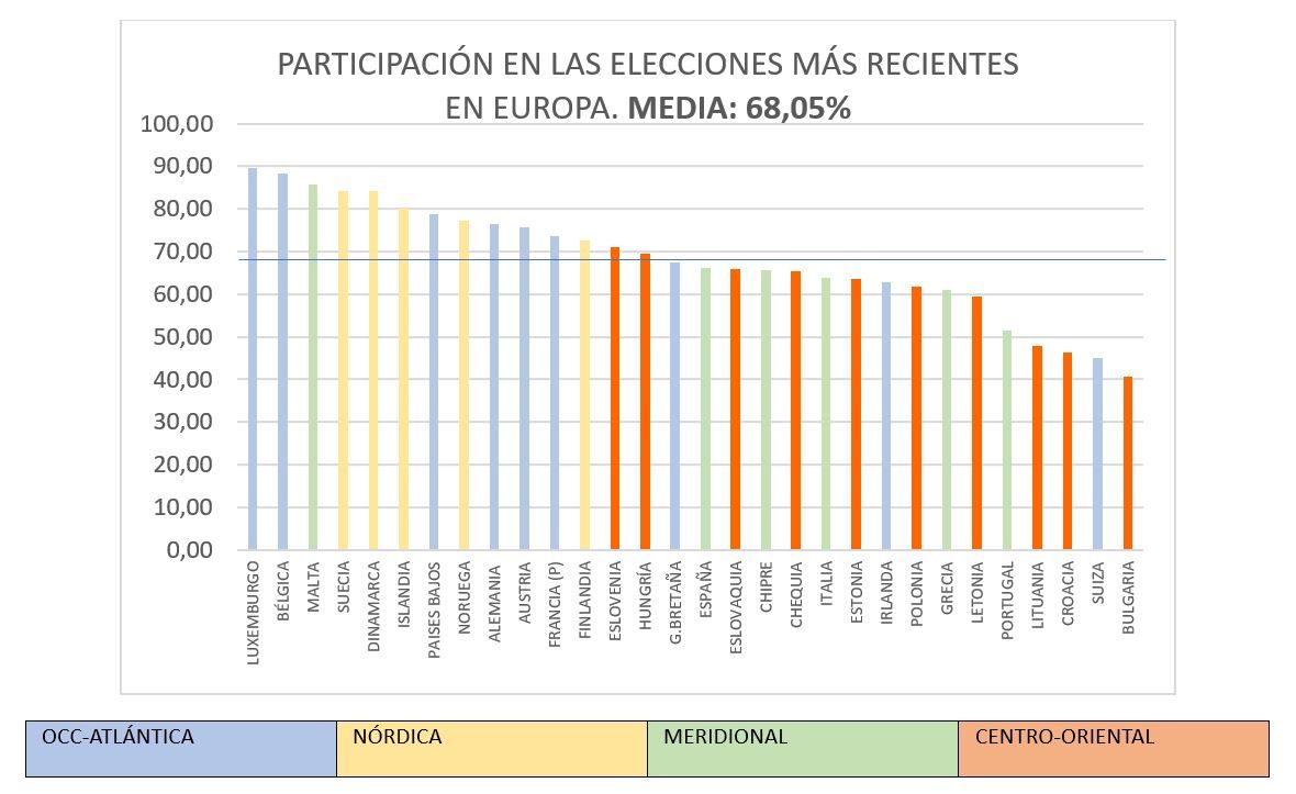 من بين الدول الاثنتي عشرة التي تجاوزت متوسط المشاركة الأوروبية في الانتخابات الأخيرة، تنتمي ستة منها إلى منطقة غرب المحيط الأطلسي، وخمسة إلى منطقة الشمال (أي جميعها)، وواحدة فقط إلى الجنوب (مالطا) واثنتان إلى منطقة الشرق الوسطى (سلوفينيا والمجر). ولكن إذا رفعنا الحد نقطة واحدة فقط فوق 70٪، فإن جميع الولايات التي تجاوزت هذه النسبة كانت في منطقة غرب المحيط الأطلسي أو منطقة الشمال. من الواضح أن الاستثناء هو مالطا، وهي دولة صغيرة جدا يبلغ عدد سكانها أقل من 400,000 نسمة (مثل أي منطقة مكتظة بالسكان في مدينة أوروبية كبيرة) ونظام انتخابي يفضل نظام الحزبين. إقبال كبير على التصويت أمر شائع في الكيانات السياسية الصغيرة. من ناحية أخرى، فإن 17 دولة ذات نسبة مشاركة تساوي أو تقل عن 71٪ تقع في المنطقتين المتمايزتين الأخريين: الوسط الشرقي والجنوب. يتم ملاحظة هذا الاختيار الجغرافي أيضا إذا أدخلنا في التحليل التطور الانتخابي منذ عام 1990. يعتبر الانخفاض الملحوظ في نسبة المشاركة في بلدان الوسط الشرقي وثيق الصلة بالموضوع. نقسم هذه المجموعة من البلدان إلى ثلاثة رسوم بيانية من أجل التوضيح.