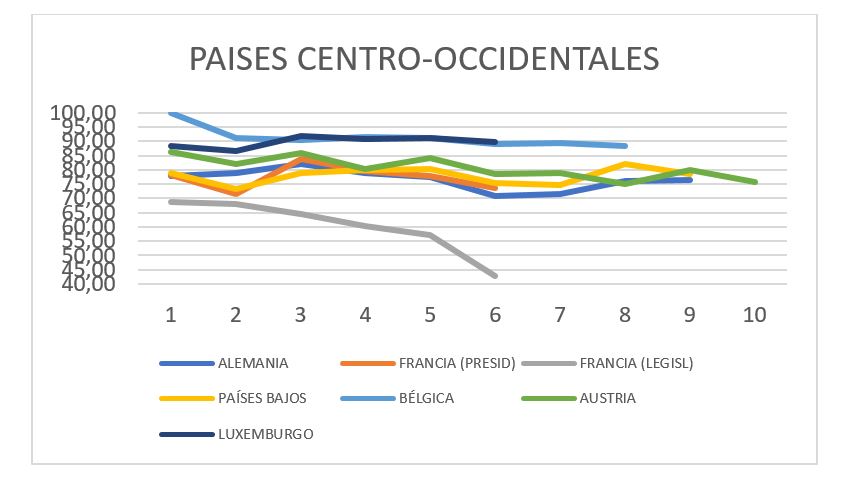 في الدول الغربية، ظلت نسبة المشاركة عند مستويات أقل بقليل من متوسط دول الشمال، لكنه على أي حال، كان مستقرا ومرتفعا، فوق 75٪. لم تصل فرنسا بفارق ضئيل إلى هذا المستوى في الانتخابات الرئاسية وعانت من انخفاض حاد للغاية في الانتخابات التشريعية. كانت الأرقام أقل إلى حد ما في البلدان الأنجلو ساكسونية، أقل قليلا في أيرلندا (2.5 نقطة) وأكثر ملاحظة في المملكة المتحدة، مع خسارة 10 نقاط.